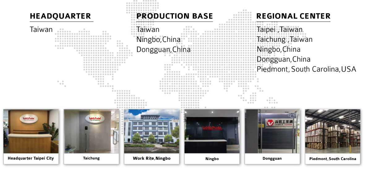 Our head office is set up in Taipei (Taiwan), and we also have branch offices in Taichung (Taiwan), Ningbo (China), Dongguan (China), and the Piedmont, South Carolina (USA).